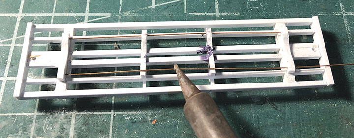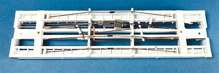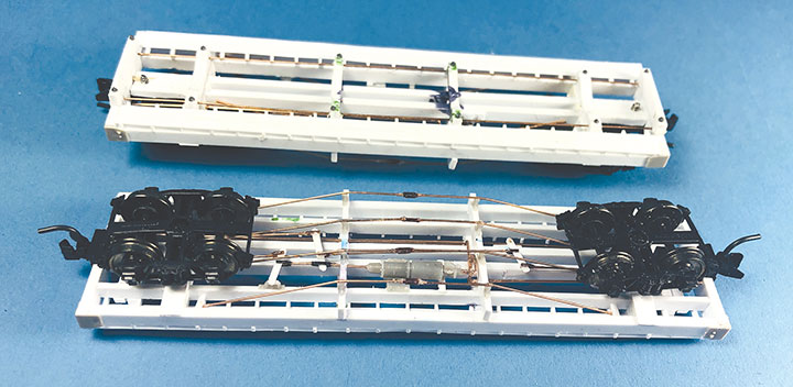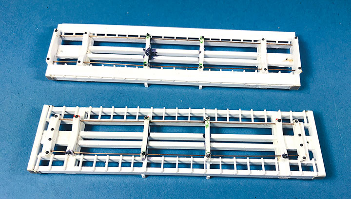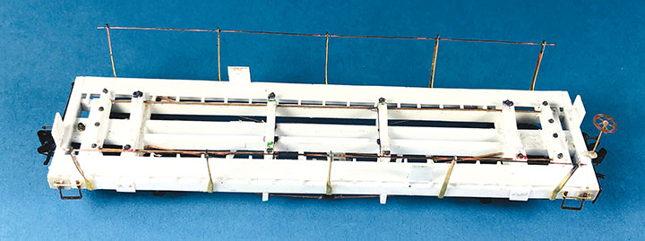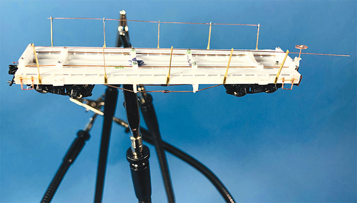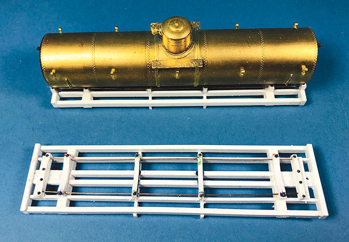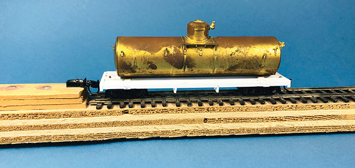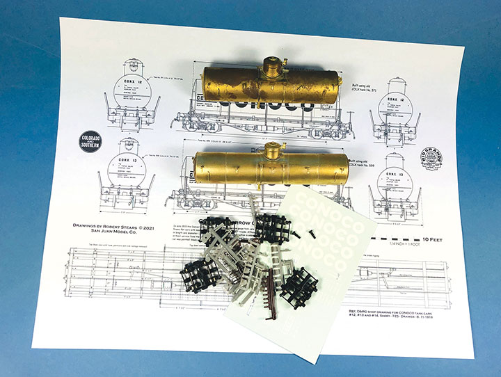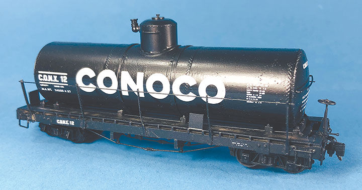 Conoco tank cars 12 and 13 have been set out on the author’s HOn3 layout at Vance Junction waiting for the local crew to bring them to the Conoco dealer in Telluride.With plans in hand, I dug through my parts to make tank car “kits” for CONX 12 and 13. I also used a variety of Evergreen styrene strips, wire and brass strips. If you want to assemble your own “kit,” the tank in the HOn3 Precision Scale Co. kits for the Frameless and Narrow Frame tank cars would be a suitable stand-in for CONX 12. The tank for CONX 13 is longer and skinnier than number 12, and I don’t know of a suitable substitute. It would probably have to be scratchbuilt or 3D printed.Since I was making more than one identical frame, making a jig helped with assembly and consistency. Since I still intend to make CONX 14 someday, I had a third reason to make this jig. The dimensional lumber in the prototype plan are odd ball sizes. Since a one-inch difference in HO scale is hard to see, I chose to use the next closest lumber sizes offered in Evergreen styrene. The end beams are 6- x14-inches, so I made my own by gluing 6- x 8- and 6- x 6-inch “timbers” on top of each other. The outside and center beams are 6- x 10-inches, and the intermediate beams are 4- x 10-inches. The truss rod beams are also 4- x 10-inch styrene. I used a .060-inch square block for the coupler box support and to set the distance in from the end beam where the bolster would be assembled. The screw hole for the truck is .125-inch OD styrene tube. The rest of the bolster is made up of .125-inch square blocks. Missing from the photo is the 1- x 12-inch cap that I put over the bolster blocks.I notched the end beams to accept Kadee #714 couplers and used Blackstone 3’ 7” D&RGW freight trucks with these models. With the larger elements together, I weighed both cars. They came in at around 1.5 oz. each, which is about perfect for an HOn3 car this size. I didn’t end up needing to add any additional weight in the tank. If you make your CONX 12 using the plastic Precision Scale Co. tank, don’t forget to add some weight to the car. The frame weighs nearly nothing.I find that the trickiest part of scratchbuilding rolling stock is getting the trucks to swivel freely, and have the coupler at the correct height. I ended up adding a 4- x 10-inch block on the bolster king pin to set the trucks farther from the frame which would allow them to swing freely, and to raise the coupler height. I checked the coupler height using my home-made gauge. NOTE: On the finished models, I shaved the coupler blocking down some more to get a better match for the coupler height. The next task was to build the frame and saddles for the tank to sit in, and on top of, the car frame. Each car has 4 saddles. To get them all curved the same, I cut 6- x 10- and 4- x 10-inch blocks oversized. I taped the blocks tightly together and used a curved file to match the contour of the tank. Once I was happy with the curve, using the tank as a guide, I glued the saddles in place on the frame.The tanks on the prototype cars had end blocks to keep them from sliding on top of the frame and from buffeting forces on the train. These end blocks were joined together with rods that run through the four saddles. The entire assembly worked together to form a cradle for the tank. Because of the imperfect nature of scratchbuilding, it wasn’t practical to pre-drill all the blocks before assembly. Undoubtedly, something would be out of alignment and the tension rod would have an un-prototypical bend in it. Drilling the center blocks once they were installed was also impossible. What I decided to do was drill holes in the end blocks and then using a soldering iron, I heated .015-inch phosphor bronze wire so that it melted its way through the styrene saddle blocks and into position. Once in place, I used Squadron putty to clean up the melt line left in the styrene. This worked surprisingly well.To finish the tank saddles, I added Grandt Line #5123 NBW castings to simulate the bolts on the ends of the tensioning rods. Using the drawings as a guide, I added Grandt Line #5096 NBW castings where the tank car saddles would be bolted to the flat car frame.It was now time to install the walkways down the sides of the cars. Using the drawings, I installed a lot of 2- x 4-inch blocks on edge between the outer and intermediate stringers. On top of those blocks I added a parallel set of 1- x 8-inch boards for the length of the car. The photo shows one car with just the blocks in place, and the other car with the boards installed over the blocking. Notice that the longer tank on CONX 13 (top) requires the tank saddle to be the full length of the car, while CONX 12’s saddle (bottom) is shorter and inset from the car ends.I realize that few people ever see the brake details on an HOn3 model, but I just don’t feel right leaving them off. So, I scratchbuilt all of the brake rigging on the cars following the drawings. The first thing I did was bend and install .020-inch phosphor bronze wire for the main airline that runs the length of the car. I temporarily removed one of the truss rod beams to make this easier to do. Then I installed a brake cylinder from a Grandt Line #5040 Westinghouse NG Brake Set. More .020-inch wire was used to “plumb” the cylinder into the main airline. Number 70 holes were drilled in the truss rod beams to allow the brake rods to pass through them. I made the brake rods from .015-inch diameter wire. The clevises on the ends of the rods were made from Grandt Line #5039 turnbuckle castings with one end cut off. The brake levers are 1- x 4-inch styrene with the corners chamfered off. Where the rods would connect to the trucks on the real car, I simply glued the rod ends to the car’s center beam to keep them out of the way of the truck swing.Most HOn3 models use fishing line threaded through turnbuckle castings to simulate truss rods. Since this car has an open deck, the ends of 