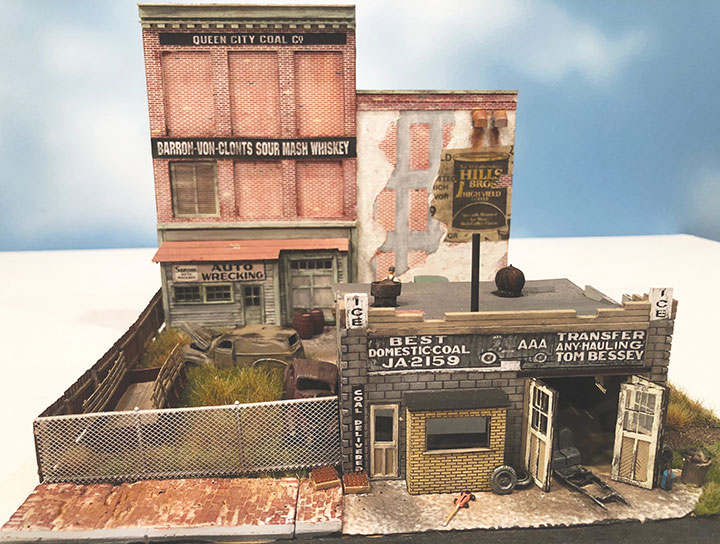 Art sent me a pre-production component of this kit some months back so I could assemble it and make the deadline for this issue. I built the Tom Bessey Auto Repair and Samson Auto Wrecking/Barron Von Clonts Sour Mash Whiskey fronts. Unlike the rest of the diorama, this part features two adjacent background bas-relief structures with a pop-out office for the auto wreckers, and separate small auto repair/coal dealer business in front. Included are a chain-link fence and weathered sidewalk sections. I added the extra Woodland Scenics junked automobiles and details to create a sceniced mini-diorama.