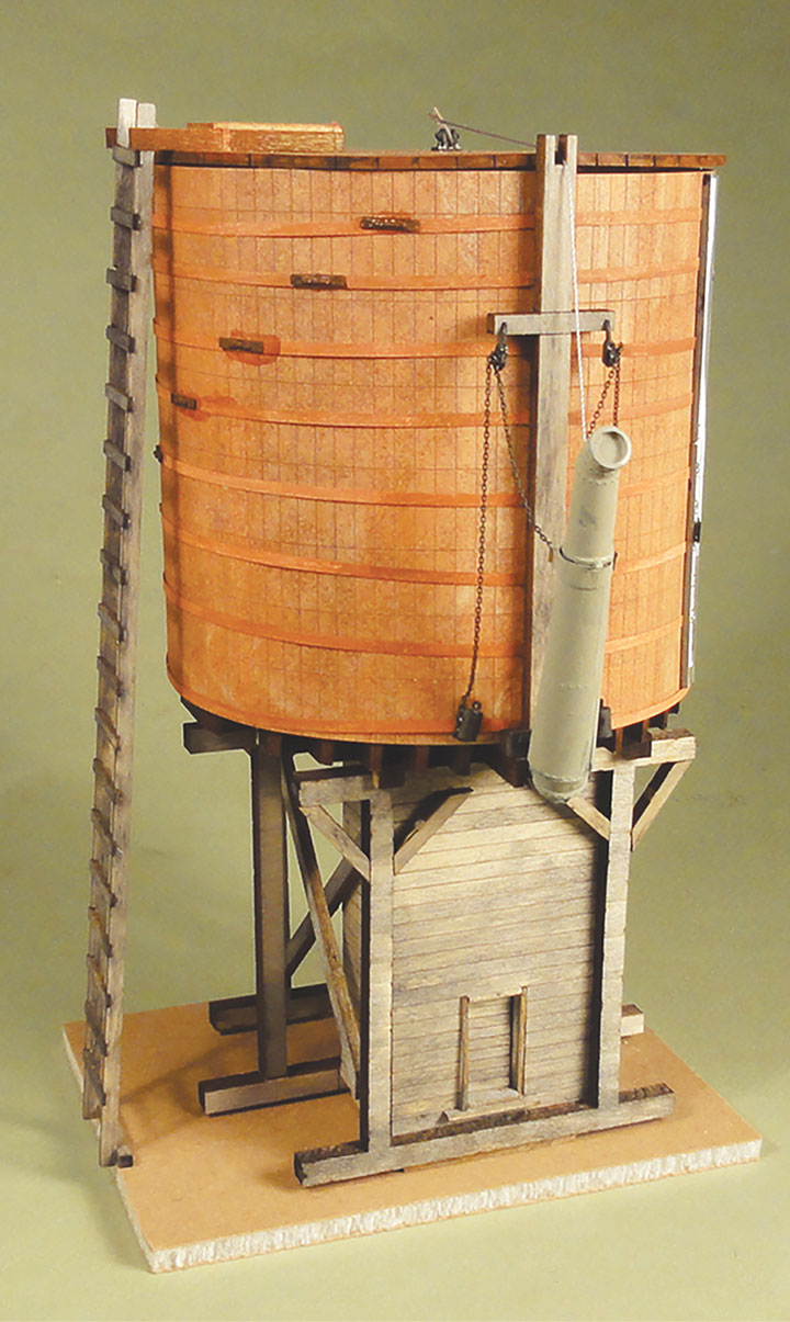 The water tank is composed of two wood discs held apart by seven laser-cut supports. It is essential these supports are vertical, so use a square. Once dry, an inner wrapper is glued around the discs, again make sure you start with a vertical wrapper — use a square. Then when dry, you wrap an outer wrapper around the inner wrapper, don’t forget to use the square. My outer wrapper fit perfectly, with no gap. You can use the provided thread for wire hoops or use flat bands. I decided to use flat bands. They are provided for you in a one piece, laser-cut, set of paper bands properly spaced. Actually, you get two sets of paper bands which seemed ominous to me. I wiped my outer layer before attaching it with Floquil Zinc Chromate Red, and also wiped the paper bands. When dry, and again using a square, I glued one end of the bands to the outer wrapper, let it dry, and then wrapped the bands around the tank with spots of glue. It was like gluing spider webs, and I see why two sets of bands were provided, but I had no trouble. The tank is detailed with band fasteners, a roof hatch, and spout and pully system. There is also a ladder that has an assembly jig. Be careful nipping the jig out if its fret. I lost one side of my jig, but retrieved it, glued it back in place, and had no trouble assembling my ladder. The water level numbers are printed on paper. You just have to trim the strip and glue it into the cast metal U channel and attach it to the tank. There is even a cast metal level indicator. I like my tank and will use it to replace an old tank on my layout. It was fun to assemble and has that run-down backwoods look we all enjoy.