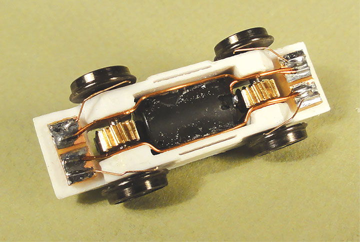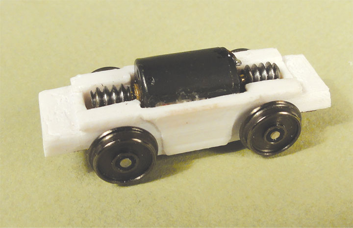 The power truck’s frame is 3D printed and holds a small can motor with a worm and gear drive to each axle. There are pickup wires going to all four wheels. The power truck is only 1¾-inches-long, and the motor barely sticks up above the frame, making it ideal for all sorts of section cars, and little rail cars needing a small power source.