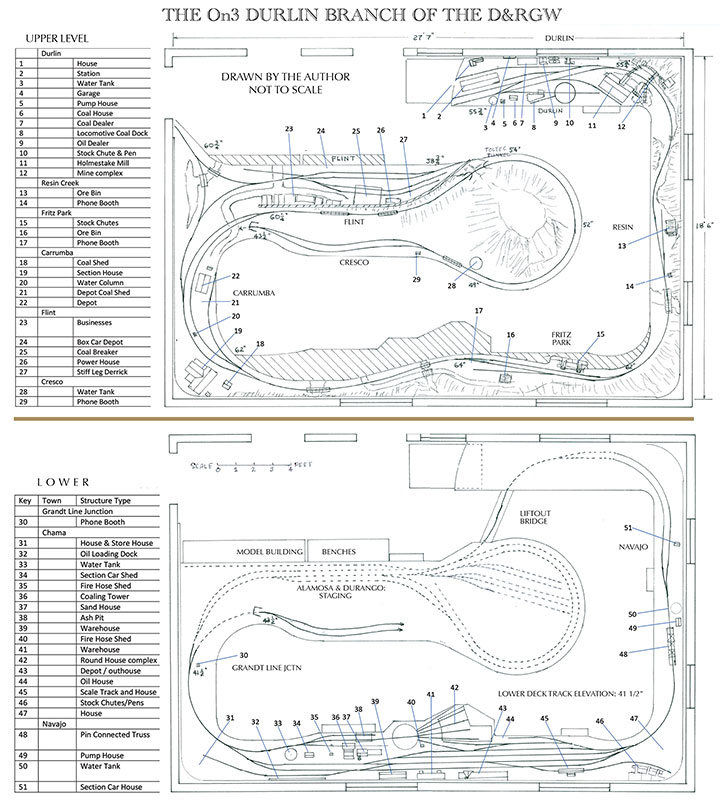 While the track plan would be freelance, there were constraints. No blockage of the three doors in one corner of the room (garage, house, exterior layout entry), no blockage of the window next to the exterior entry, and the Durlin sections. These constraints and the desire to represent Chama dictated that Durlin would be on the wall with the exterior door and adjacent window, and Chama would be on the opposite 27-foot 6-inch-long wall. The plan and orientation for Chama evolved from studying different Chama track configurations over the years, keeping the reach-in distance reasonable, and maximize aisle space. The rest of the plan only needed to connect Durlin to Chama, include staging for Alamosa and Durango, a second branch, and the other goals. A number of double deck plans with a connecting helix were drawn, and foam core models made. These were discussed and improved by friends, but something was wrong. Helper engines working trains up multi-turn helix would not support the vision of narrow gauge steam working up steep grades in Colorado that was in my mind’s eye.
