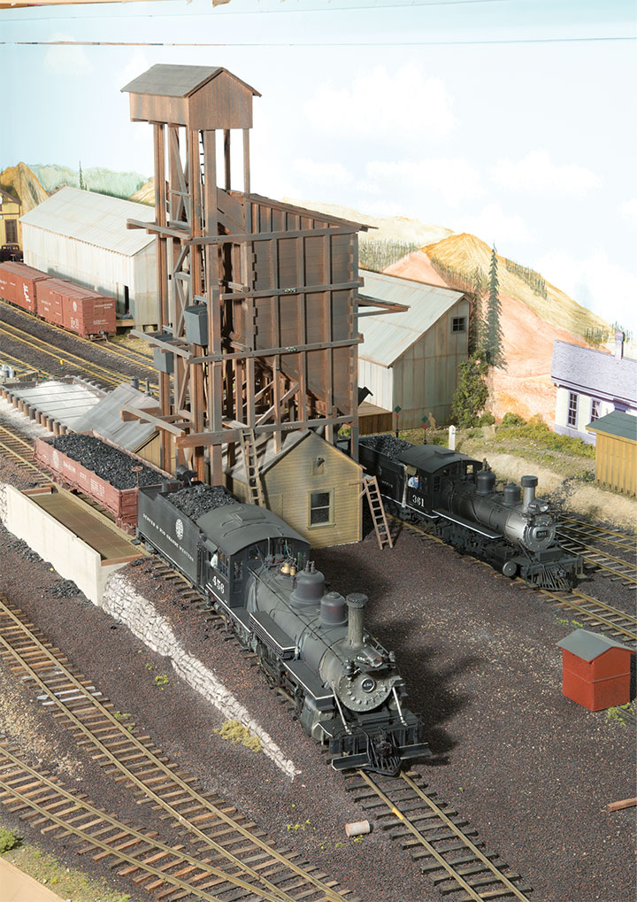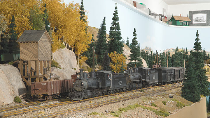 If the entire length of a peninsula down the middle of the room were used for an out and back climb to the second deck, the 181/2-inch elevation gain needed to clear the top of the coaling tower in Chama could be accomplished with a 3.8 percent grade. And the need for helpers would be real. By keeping the grade after the end of the peninsula turn back loop fairly close horizontally to the lower part of the grade, half the width of the peninsula could be used for staging on the lower level, while half of the upper level could be the end of the second branch line. With the general routing of the main line set, the sidings, on-line spurs and a few prototype scenes could be planned.