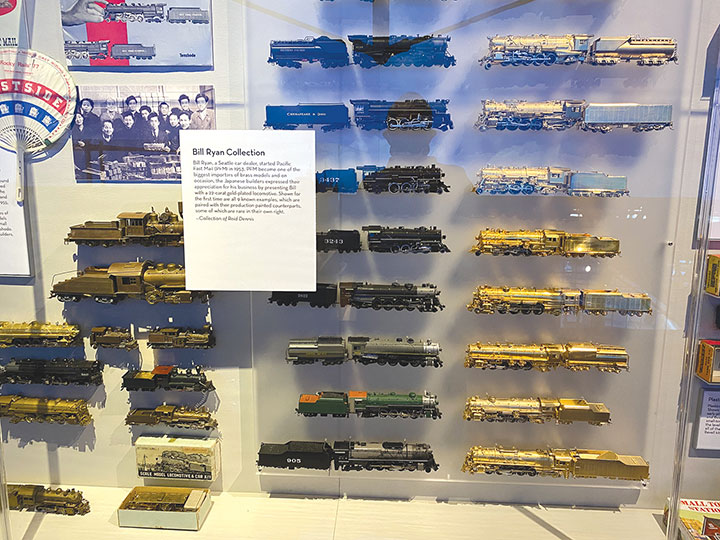 We call the next era, the Brass Revolution. Right after the war, several small Japanese factories began building brass locomotives to order for the GIs. Our exhibit has an On3 C&S Mogul built for a naval Commander and brought home. There are also several examples of other brass models, and a set of nine gold-plated locomotives presented to Bill Ryan of PFM by his builder, in thanks for his business. These very rare models, along with most of the brass models on display, were donated by brass collector, Reid Dennis.