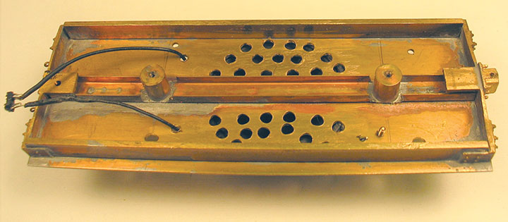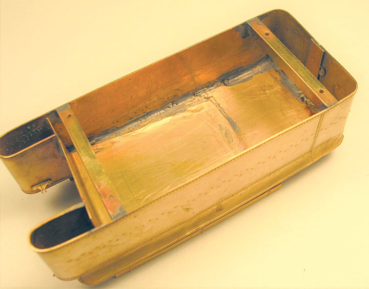 I then bent my wrapper to the proper shape around a brass rod and fabricated the top from brass sheet. After the shell was complete, I soldered brass angles inside to act as combination braces and mounting strips. I drilled and tapped these strips for 0-80 screws to hold the shell to the frame. The floor is .032-inch- thick sheet brass, with brass bar stock and Kemtron end beam castings completing the frame.