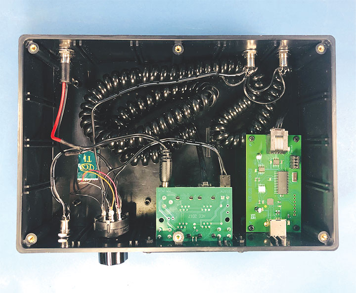 Looking from left to right across the front of the box (bottom of photo): There is a female plug used for a DC input from a DC power supply. This is wired directly to the rotary switch beside it. The rotary switch is used to control the power to the two output sockets. The options are DC power, DCC Decoder power or straight DCC track power. Next, the NCE faceplate takes its power from the power adapter input from the back of the box, and sends a DCC signal to the Decoder and straight to the rotary switch. The last component is the NCE USB adaptor board. The USB board’s supplied coiled wire is stuffed in the box and plugged into the back of the NCE faceplate.