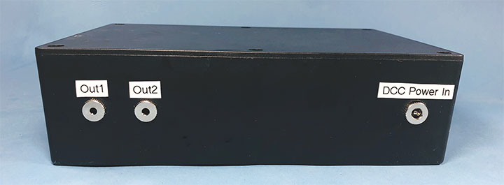 On the left, there are two identical 3.5mm outputs. One output will go to my test track, while the other can be used to plug in a second set of test leads for working on locomotives in a foam cradle.