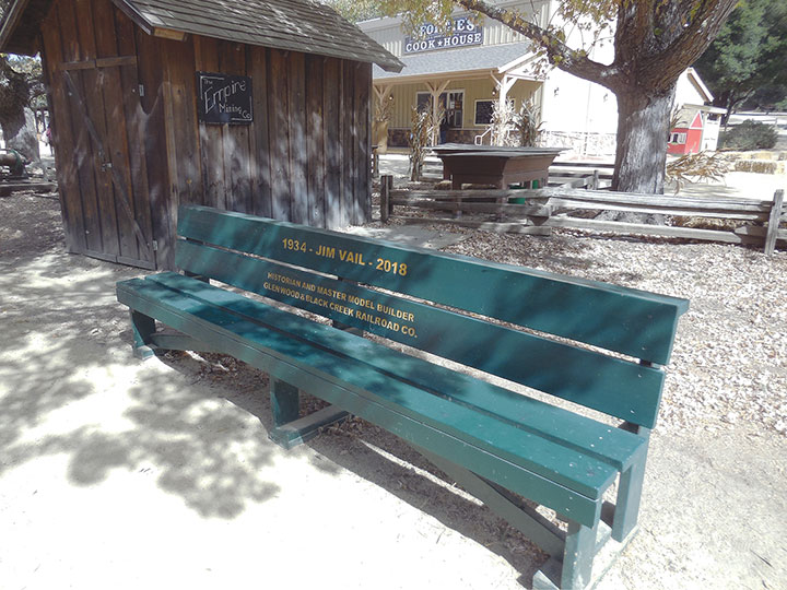 I recently visited Roaring Camp to inspect the Jim Vail Memorial bench. It is in good shape and in a great location for train watching.