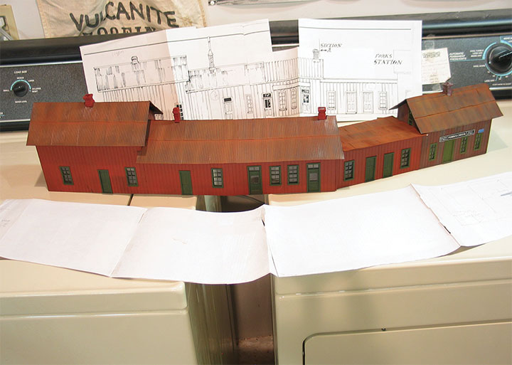 I recently started working on the Forks Creek wye area again and kept thinking about the eating house. I wasn’t sure I could squeeze it into the narrow space next to the station at the edge of the layout. I cut pieces of paper the exact size of the space and taped them together to make a full-sized footprint of the available space. I then enlarged Harry’s HO drawings to O Scale to see if the buildings would fit. I was pleasantly surprised to see they would, with a few inches to spare.