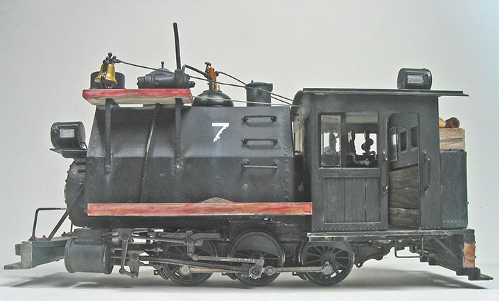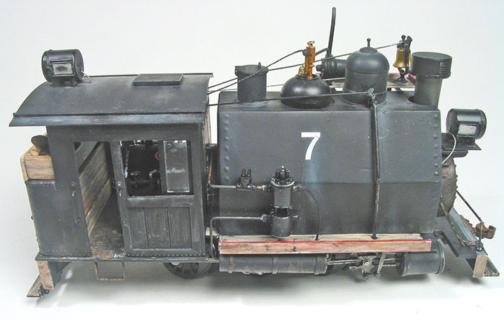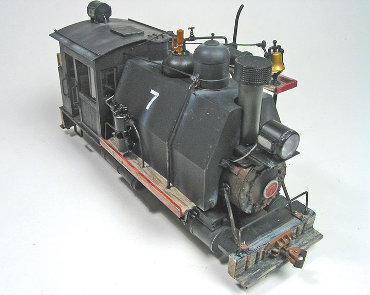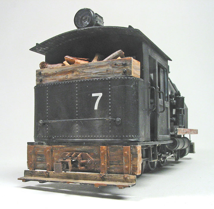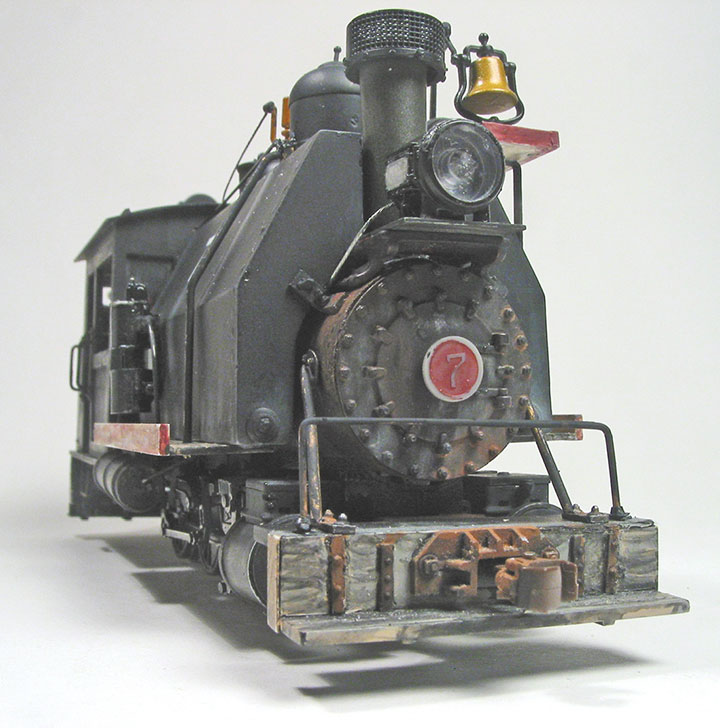 The Michigan-California Lumber Company shops constructed the unusual “A” frame tank, as I refer to it, on two small switch engines. The second 0-4-0T, a Vulcan built around 1900, is the one I used as inspiration for both Les’ and my models. On the prototype there were two adjoining tanks, one smaller in the rear for fuel oil and a larger tank in the front for water. On Les’ printed tank there was a groove that represented this separation. I filled this groove with epoxy and then sanded it smooth to get the impression of one large water tank.