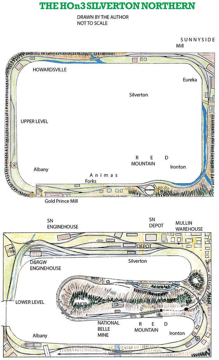 My first layout lasted about 10 years. The second, started in 1994, was built in a 20- x 12-foot shed on two levels joined by a 2½ turn helix. It had a generic Silverton, Burro Bridge, Red Mountain, and Ouray on the lower level, while the SN was the upper level with Howardsville, Eureka and Animas Forks. The helix also hid a 3-track storage yard for the lower level which represented either Durango or Ridgway.