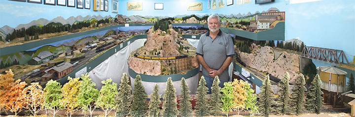There are 1500 trees on the layout, mainly the pines that form scene blocks or that run along the backdrops to give the illusion of more depth to the narrow shelves. Several Aspen groves have been included to establish the early Fall setting. The backdrops are based largely on photos of the area and given my basic artistic skills, I am reasonably pleased with the outcomes.