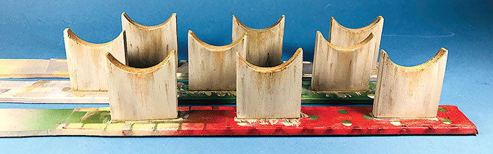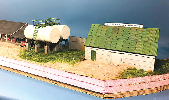I built the entire petroleum spur at my workbench, including the scenery. This diorama replaced an existing spur on my layout and was blended into the basic scenery. With the Conoco distributor in place, I now have a destination for my San Juan Models tank cars. The Texaco dealership provides me with a destination for my CYCX numbered narrow frame tanks as well as my double dome TCX tanks. The people of Placerville and the adjoining Paradox Valley will be well served for their petroleum needs.Initially I tried making the tanks using a styrene sheet wrapped around styrene disks, but all I managed to accomplish was to create a badly dented tank that looked like it was being crushed in a junk yard. That failure sent me back to the drawing board. After some thought, I took a trip to the local home improvement store and bought a length of 1¼-inch diameter plastic conduit. The outer diameter worked out almost perfectly to the 12 feet indicated on the Mike Blazek drawings (www.blazekplan.com) that I was using as a guide. I cut five pieces of conduit to 27 scale feet in length, then capped the ends with .020-inch styrene. I used Tamiya cement which seemed to work just fine with the plastic that the conduit was made from. The caps were trimmed to size and filed to create a smooth union. This photo illustrates the steps involved.Most prototype tanks constructed in the early 1900s were made by riveting a number of rolled steel sheets together. To simulate the center section of sheets I wrapped a 13½-scale-foot wide piece of .010-inch styrene around the tanks. More Tamiya glue and rubber bands held the styrene in place.The three Texaco tanks sat on top of poured concrete saddles. I used 5/16-inch plywood to simulate these saddles. The first step was to cut the plywood into strips that were a scale 12-feet wide. I then drilled 1 5/8-inch holes about three real inches apart. Then I cut through the middle of each hole creating a bunch of blocks of wood with a half a circle cut out of each end. These were then used to create saddles ten scale feet in height. When I was done, I had a pile of concrete saddle forms. I selected the best-looking ones and grouped them in sets of three saddles for each of the three Texaco tanks. The wood was then sanded smooth, and I ended up with basic forms that were used to simulate the real concrete saddles.The three sets of Texaco tank saddles were painted a base coat of Floquil Concrete. To create texture and make the wood blocks look more like concrete, I rubbed on three shades of gray Pan Pastels that ranged from an almost white tone to a medium gray. I then used an earth-colored Pan Pastel and various rust colors to add streaks to the concrete saddles. When I was satisfied with the look, I sprayed them with Testors Dullcote.With the Texaco tank saddles sorted out, I focused on finishing the tanks. I felt they needed more detail, so I used Archer textured rivets decals (AR 88098 & AR 88031) to simulate the seams in the tank pieces. I also added a row on the tank ends to simulate two pieces of metal making up the ends. These rivet decals were tricky to apply to a cylinder until I used some left-over tank saddles taped to a plastic box as a cradle. This setup made it much easier to apply the decals.I made the Texaco and Conoco tanks identical. There is one photo in the RGS Story Vol. 1 (Sundance Publications) that shows the Conoco tanks in the background, and they appear to be about the same size as the Texaco tanks. This made construction a lot easier. With all the Archer decals applied, I had all five tanks ready for paint. I ended up painting them Floquil Reefer White shortly after this photo was taken.In the RGS Story Vol. 1, if you look closely at the photos of the left-over tank bases for the Conoco facility, you’ll see tapered concrete pedestals. To create these pedestals, I used my table saw to cut basswood 3-scale-feet square. I cut this wood into 10-scale-foot lengths. Placing a 2-foot-square mask over the end of each pedestal blank, I traced a 6-scale-inch outline on the perimeter of the end of the wood blocks. Using a belt sander clamped in my workbench vice, I sanded the four sides to a taper using the 6-inch mask as my guide for making one end 2-feet square while leaving the other end 3-feet square. When I finished making these pedestal blanks, I painted and weathered them using the same technique as I did for the Texaco tank saddles.The prototype photos only show the Conoco concrete tank pedestals but don’t show any details of what the tanks sat on. Since there is no sign of steel bracing in the photos, I felt that there was probably some sort of wooden frame between the pedestals and the tank. Using 8- x 16-inch scale lumber, I created large cradles like what you’d see on a Conoco tank car. These cradles were stained with Hunterline Driftwood and Medium Brown stain. On the prototype, the cradles would have needed to be fastened to the pedestals. To simulate that, I made metal plates using 1- x 10-inch styrene with Grandt Line #5123 NBW castings to make it appear like the cradles are lag bolted to the tops of the concrete pedestals. I weathered these cradles with rust colored Pan Pastels.With the basic structures built, I wanted to see how they would fit on the existing Old Placerville vspur on my layout. I didn’t bother with the tanks, but set the other structures in place while leaving room for the tanks. I wanted to get a sense for how everything would fit into the scene, verify the elevations, and see if I could utilize the existing spur trackage. It was apparent that space was going to be tight, and the spur would need to be moved to make room for all the buildings.With the general position of where the petroleum distributors would fit into my Old Placerville scene decided, I did one more re-check of the scene with the buildings in place. I also used pieces of flextrack to determine where the spur would be aligned. Once the buildings were in