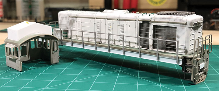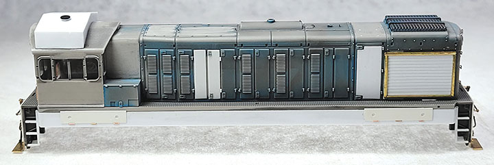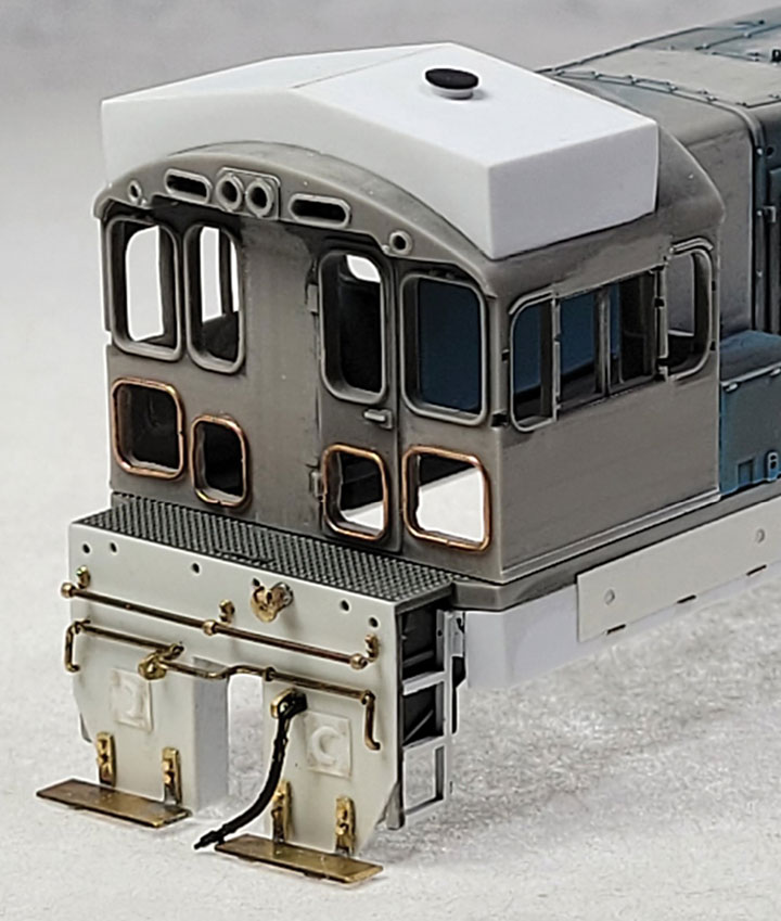 I cut out some of the side doors from the front of the long hood and replaced them with radiator grills, and used Tichy plastic handrails for the long handrails that are not on the Aussie model. Rob also used the Tichy handrails, but he cut off the plastic handrails and carefully drilled each with a #80 drill and used 0.010-inch music wire for the handrails. Rob used sheet styrene to fill in the air inlet openings on both sides, and made new doors for another section closer to the cab where the ribs had been removed. Bits of 0.020-inch styrene rod were used to simulate the hinges on these new doors. The latches were carefully sliced off of the doors at the very front and then glued in place on these new doors. Both sides of the front were filled and/or sanded as needed for the new radiator shutters and framing closer to the prototype 0.020-inches. V-groove styrene with 0.050-inch spacing was used to simulate the radiator shutters, and 1/32-inch brass angle was used to make the frame.