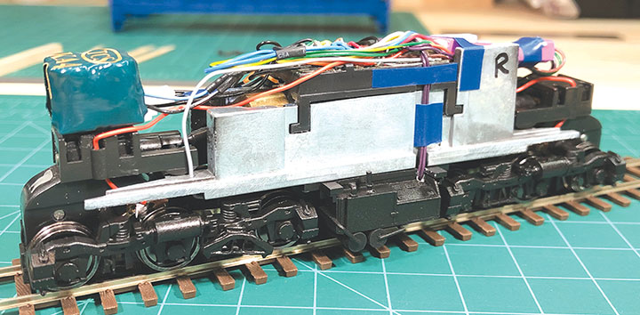 We both used a SoundTraxx Tsunami II Alco sound decoder, using the 251I6 prime mover option (Alco 251c.i.d., Inline 6-cylinder). The models are DCC ready with an NMRA 8-pin plug and provisions for speaker mounting. There is even a groove for the speaker wires to be routed on the chassis. Both of us used a modified iPhone 5 speaker hidden in the fuel tank, and TCS KA-4 Keep Alives. Each of our models used different mounting choices for the DCC equipment though. Rob mounted his Keep Alive to the underside of the long hood directly behind the light board using Loctite’s Go 2 Glue. This puts the Keep Alive above the truck gearing and out of the way. I mounted my Keep Alive to the top of the front truck gearbox with epoxy. Both models had their metal frames milled out slightly to hold the decoder above this same truck. Keep in mind that there is surprisingly little room under the body shell for any extras.