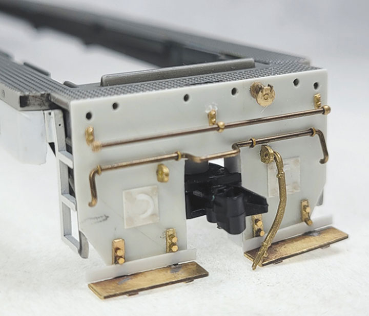 The prototype could have the couplers mounted at several heights from 22½ up to 36-inches, and the model needed a better way to simulate the space above and below the prototype’s coupler. Rob came up with a method that effectively simulates this. First the coupler mounting screw holes were drilled out on the locomotive frame with a #46 (0.080-inch) drill bit. Next, Rob bored out a piece of 0.125-inch (1/8”) styrene tube to a depth of about .25-inch with the same #46 (0.080-inch) drill bit and then cut the tube into two lengths of about 0.090-inch each. Then cut two approximately .25-inch lengths of 0.080-inch diameter styrene rod, and glued one of these into each tube; making a pair of what looked like “Battleship” game pegs. A #56 hole was carefully drilled in the center of the large end of each “peg” for a Kadee 714 mounting screw, or you could drill and tap for an 0-80 machine screw. The small end needs to be carefully sanded or filed just a little so that it fits snugly but is removable because the height of the big end may need to be adjusted. With the locomotive reassembled and on the track, the coupler height can be checked and adjusted as needed by trimming the large end of the peg. This took three or four tries and only ended up messing up one peg that required starting over! The Kadee 714 HOn3 couplers were then installed, but still needed to have the rear portion of their boxes trimmed off to clear the locomotive’s trucks.