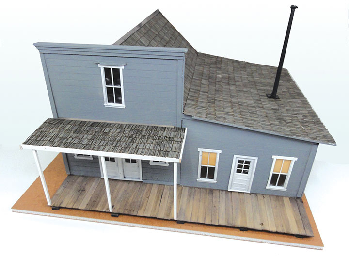 Not all the models were made by Roye, but you have to audition to be a Pendon builder by building an acceptable privy. One of the accepted modelbuilders was Chris Pilton, who wrote a book in 1987 titled Cottage Modelling for Pendon (Wild Swan Publications). I see it is still available on the internet. I have just finished reading Chris’ book and decided to try some of his techniques on my latest Bodie model of the McKenzie Brewery with its Lady’s Parlor, drawn by Neil Pfafman, in the January/February 2020 GAZETTE. Seems the ladies of Bodie preferred to drink their brew alone. But what kind of card stock would work best? I searched the internet and found Illustration Boards (#300 Illustration Board). It can be ordered on Amazon in 9- x 12-inch 3-packs, but is also available elsewhere in 5x7, 8x10, 81/2x11, 9x12, and 11x14-inch 3-packs. I ordered several 3-packs of 9x12 boards from Amazon. I found this cardboard perfect. The small size is a virtue on a small work surface. It’s about 1/16-inch thick, has a mat finish, light manila colored surface, cuts easily and takes scribing and paint well. But it is pricy. Three 9x12 pieces cost around $13.00.