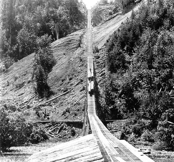 In early 1903, they installed a new lowering machine, built by the Willamette Iron and Steel Works of Portland. It was designed to lower three loaded cars down the incline at once, where the old machine could lower just two cars. The Willamette Iron and Steel ad in the February 1903 edition of the Columbia River and Oregon Timberman Magazine claimed the new machine as the “Largest Logging Engine on Earth.” The total elapsed time for the three loads to make the round trip, including the dumping of the logs, was just twenty minutes.